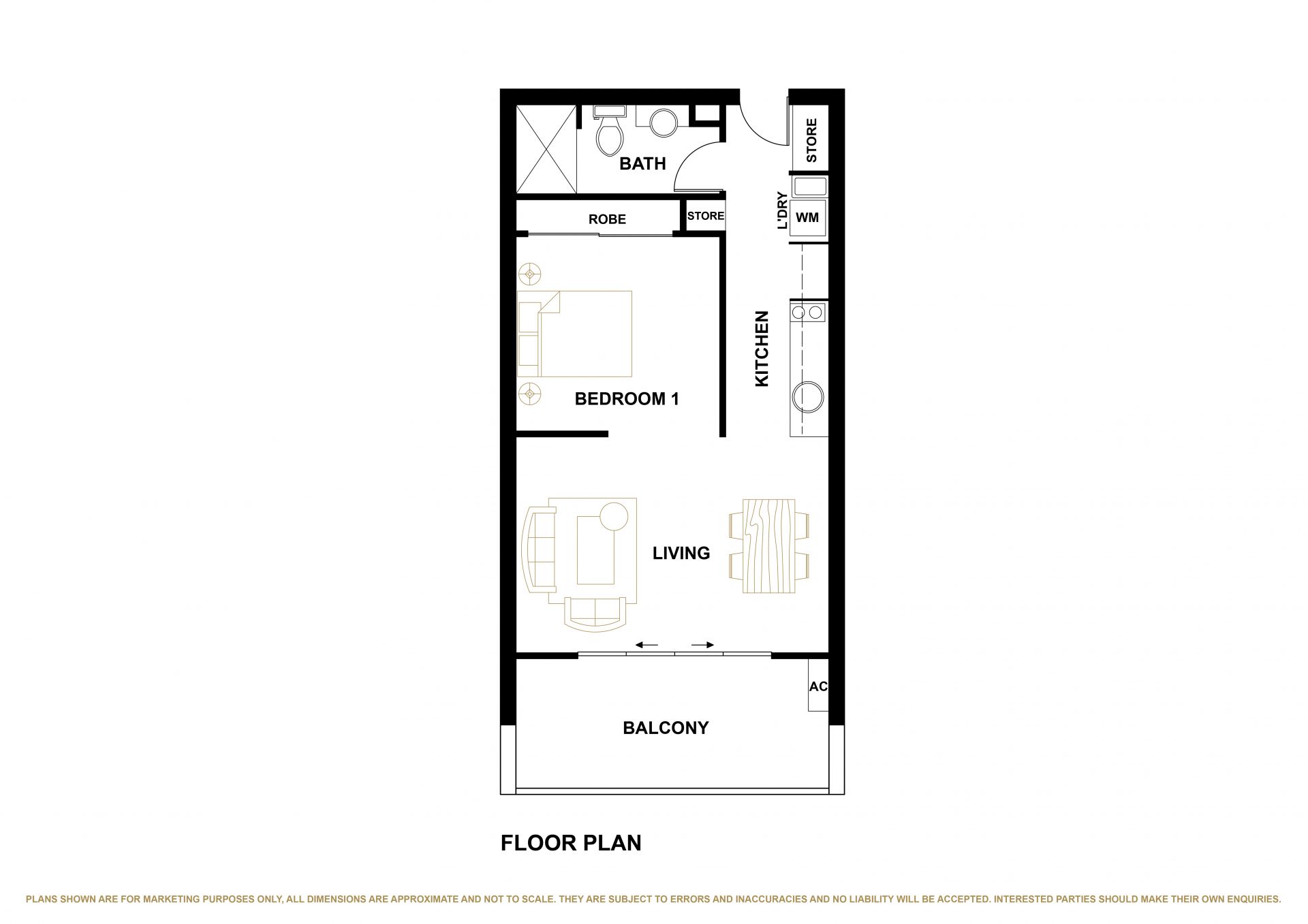 The well-designed studio floorplan features open plan living and dining areas complemented by a functional kitchen with a cooktop, oven, rangehood, and dishwasher. The bedroom area offers generous proportions and is partially screened from the living area, which still allows plenty of natural night to all spaces. Timber laminate flooring throughout creates a contemporary feel, while reverse cycle heating and cooling ensure comfort year-round.