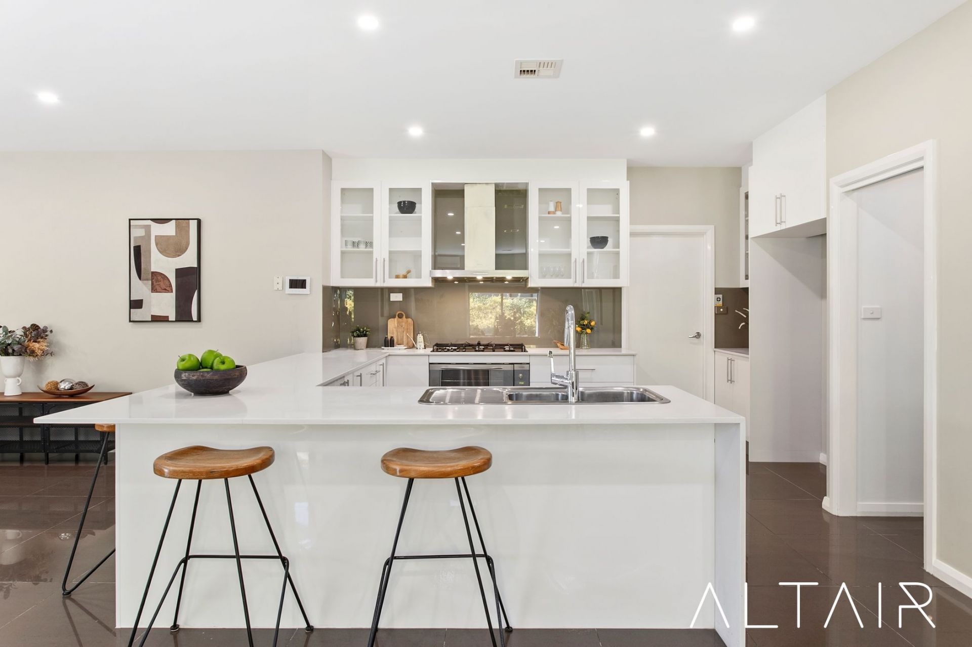 At the heart of the home, the modern kitchen is both stylish and functional, featuring a spacious U-shaped stone benchtop with waterfall edges overlooking the dining area. High-quality appliances include a 900mm five-burner gas cooktop, canopy rang hood, 900mm oven, Bosch dishwasher, ample storage, and a large walk-in pantry-perfect for effortless meal preparation and entertaining.
