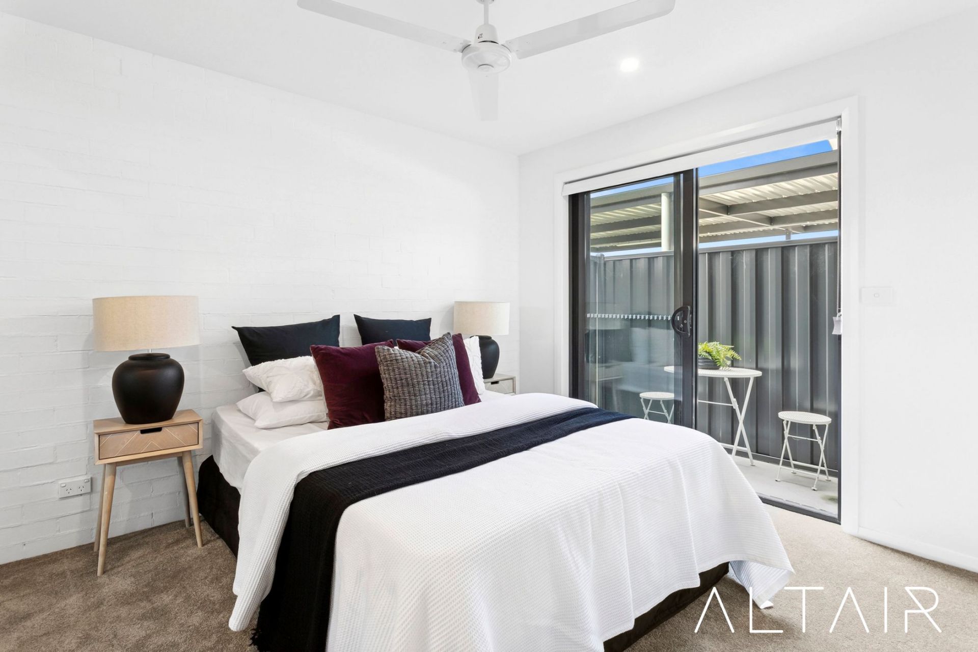 At the rear of the home, the generously sized bedroom offers a quiet and private retreat, complete with plush carpets and a large built-in robe. The adjacent bathroom is beautifully appointed with modern finishes, including a wall-hung vanity, a large shower, and floor-to-ceiling tiles. A second courtyard, accessible directly from the bedroom, ensures an additional private outdoor space, bathing the home in natural light.