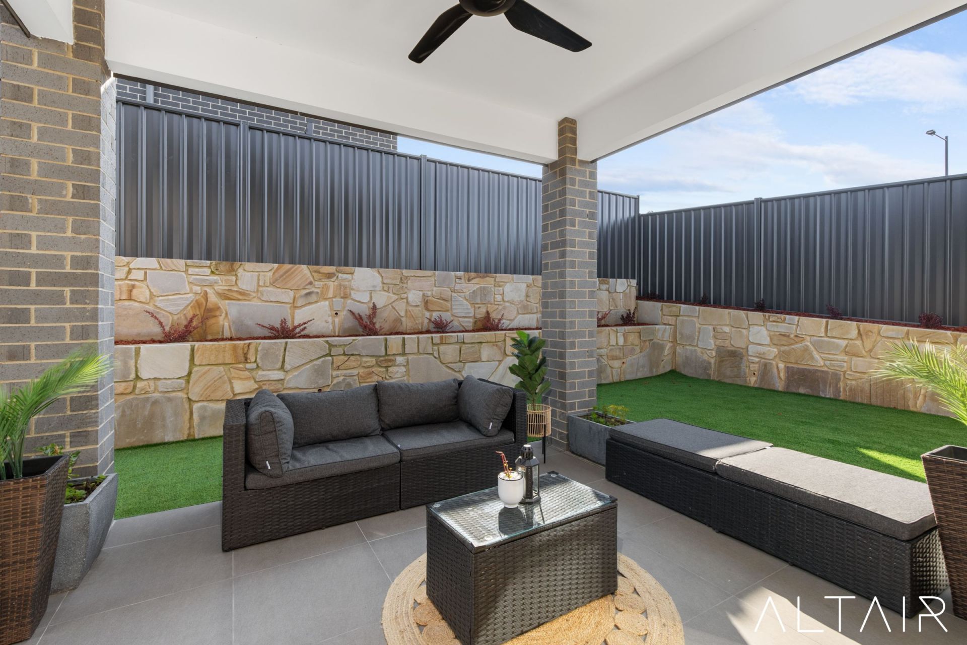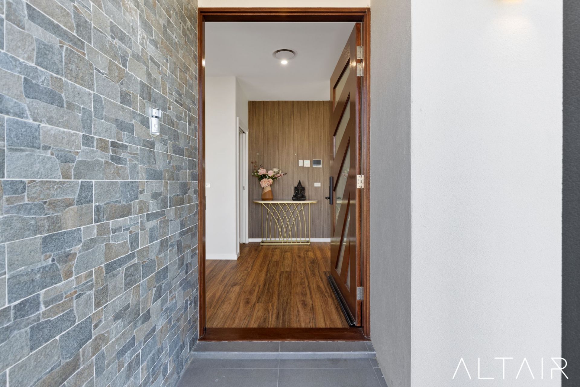 Introduced by its wide frontage and framed by magnificent, skillion roof, a combination of render & feature cladding facade, the landscaped wide frontage leads the way to a welcoming entrance portico with stone look tiles creating a lasting first impression.