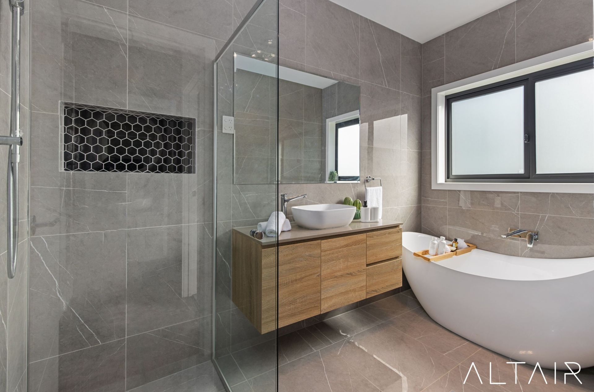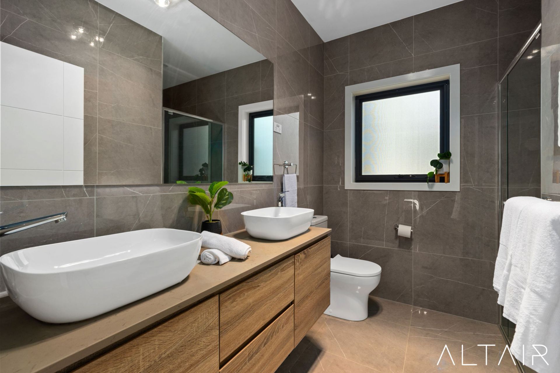 - Full-height feature tiling, designer fittings & floating vanities in bathrooms
