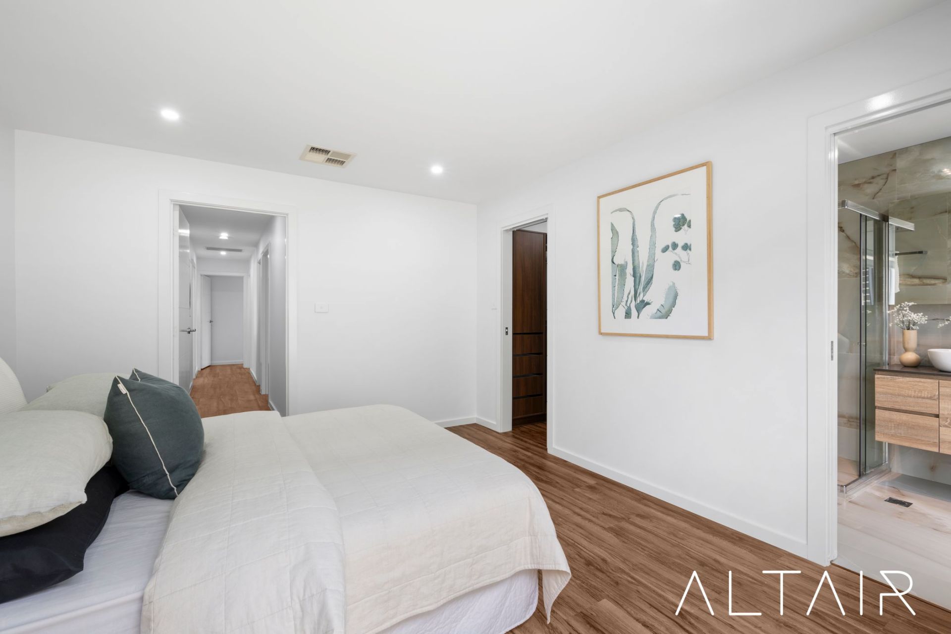 Accommodation is thoughtfully zoned for privacy, with three bedrooms located along a central hallway. Each of these rooms includes custom built-in robes and enjoys close access to the central bathroom, which features designer fixtures, a large shower, and a freestanding bathtub. The laundry with external access and a dedicated linen cupboard add further convenience. The master bedroom is privately positioned at the rear of the home and offers an oversized walk-in robe and a luxurious ensuite complete with a rain shower, offering a true retreat at the end of the day.