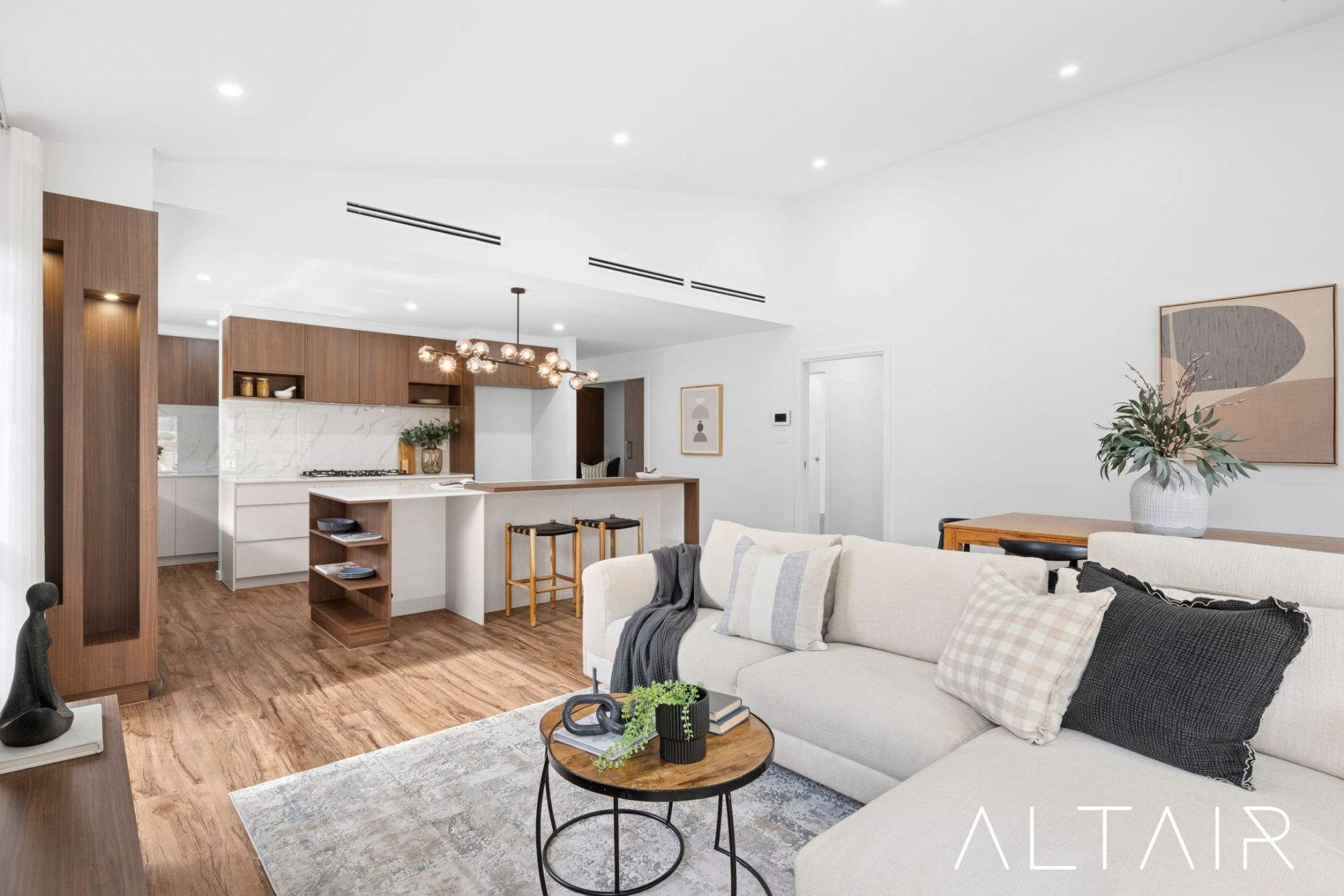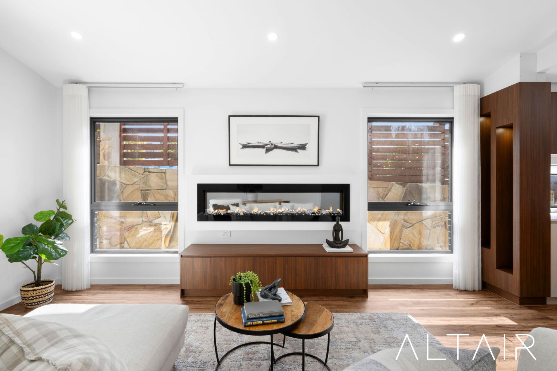 The light-filled open-plan family area is framed by high raked ceilings, large picture windows, and an ambient electric fireplace that together create a warm and inviting atmosphere. Glass sliding doors open seamlessly to the covered alfresco area, ideal for year-round entertaining and creating a seamless indoor-outdoor flow.