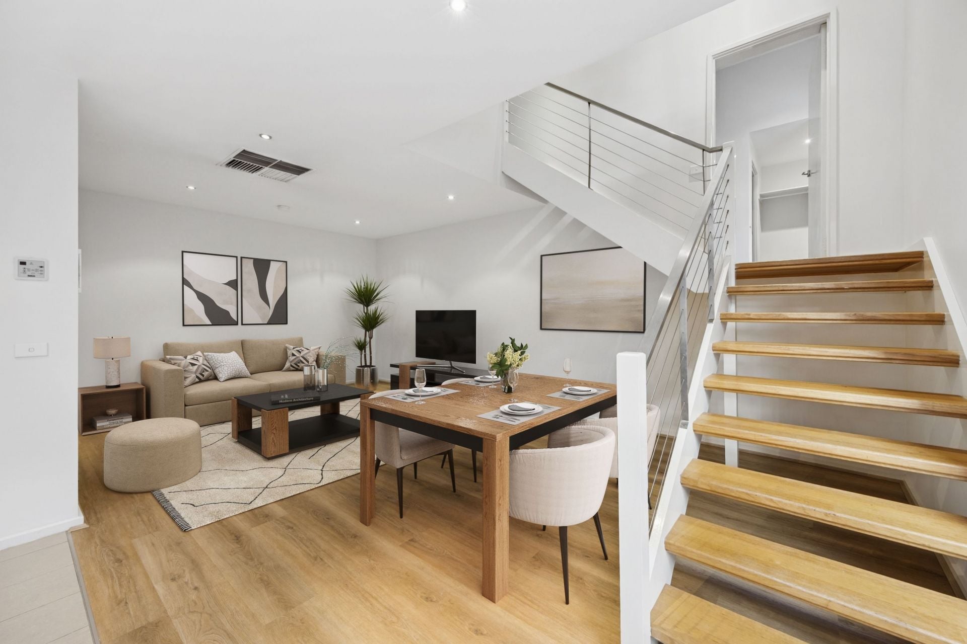 • Open plan living and dining areas with feature open tread staircase leading upstairs
