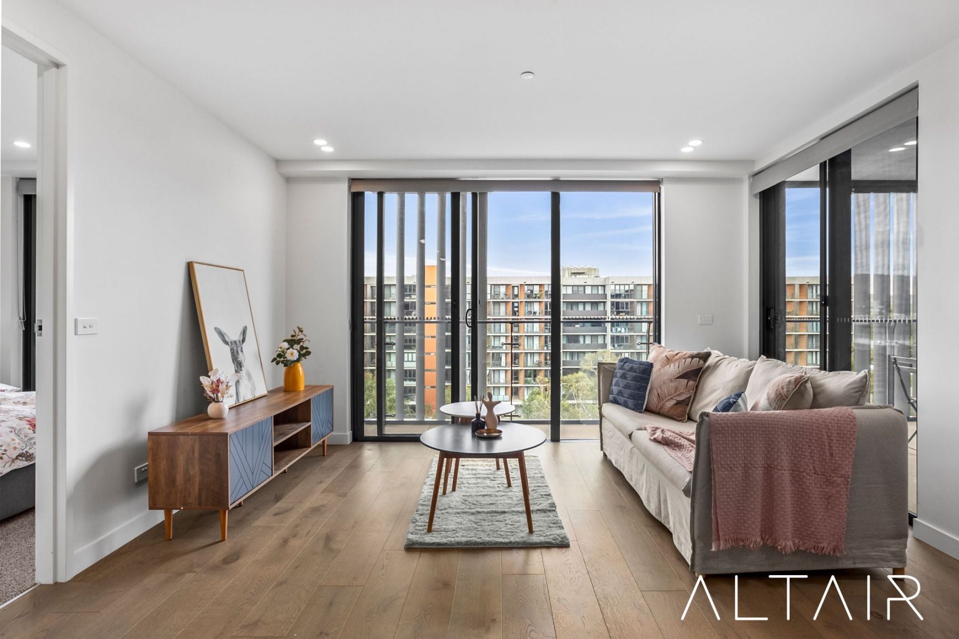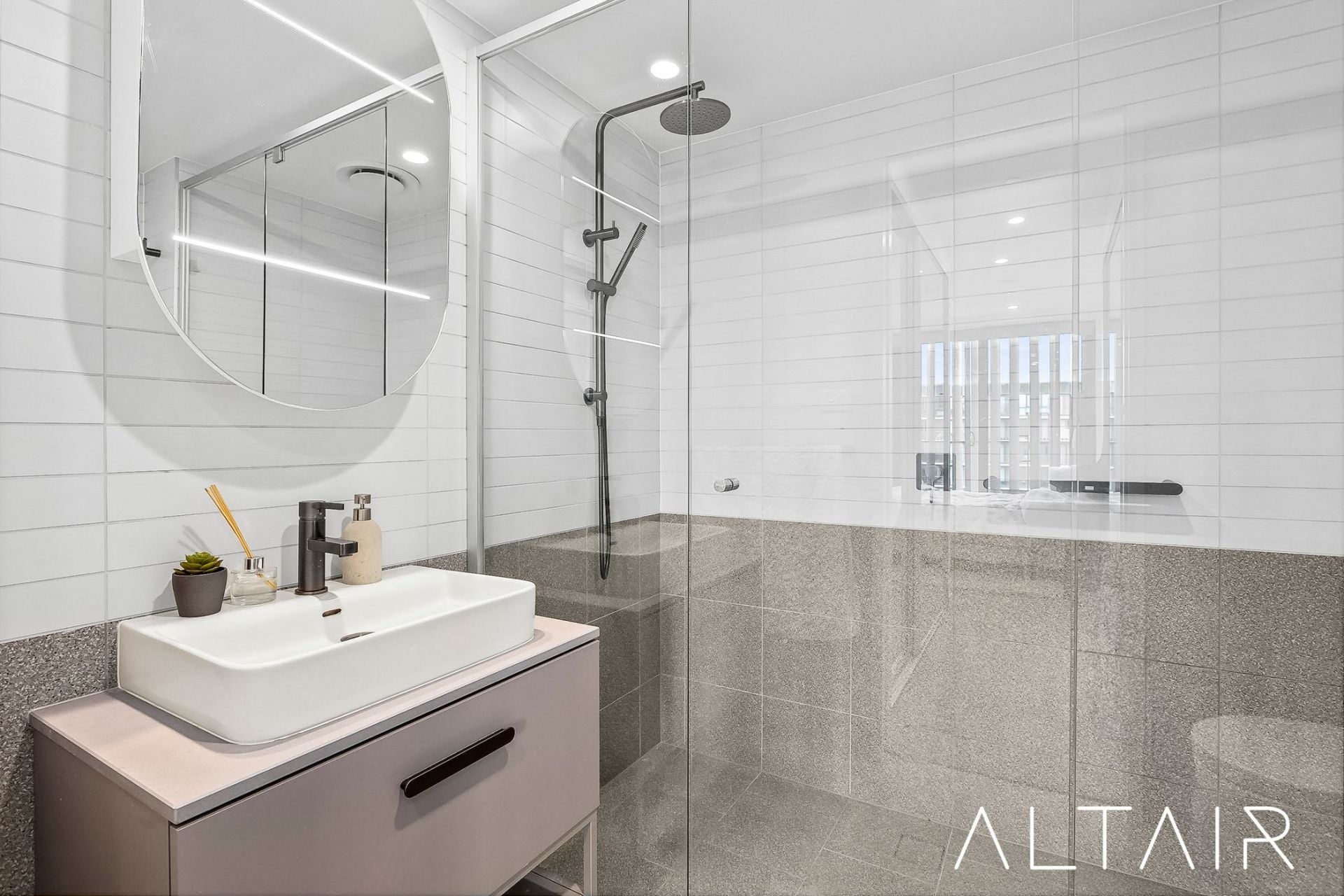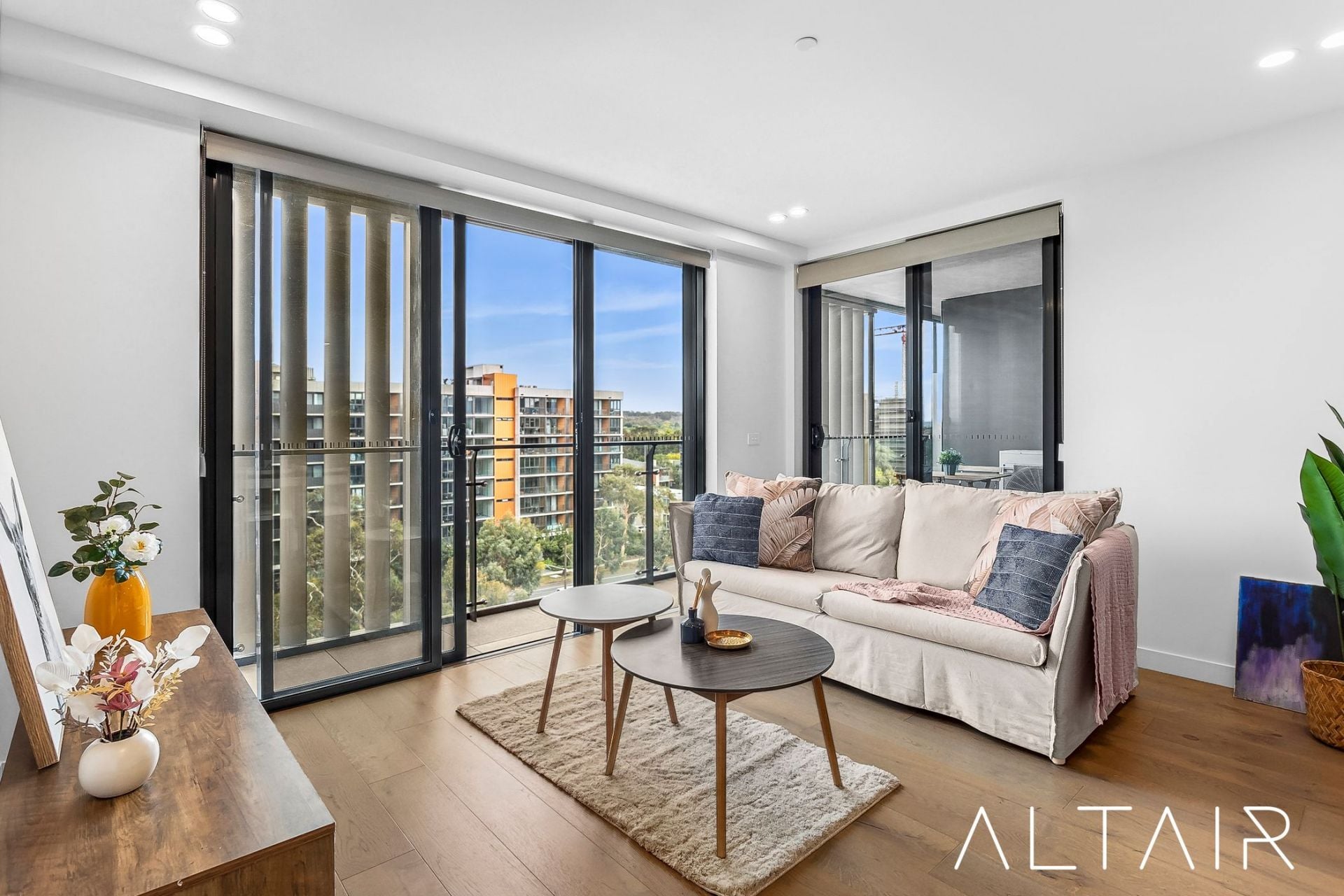 The open plan living spaces are generous in size & offer high ceilings and full height glass windows and doors, giving a real sense of space throughout the property. The bedrooms are segregated on both sides with the master bedroom offering an ensuite bathroom & expansive walk-in robe. The modern bathrooms both feature designer finishes including full height tiling, custom built vanity units, semi-frameless shower screens & backlit mirrors.