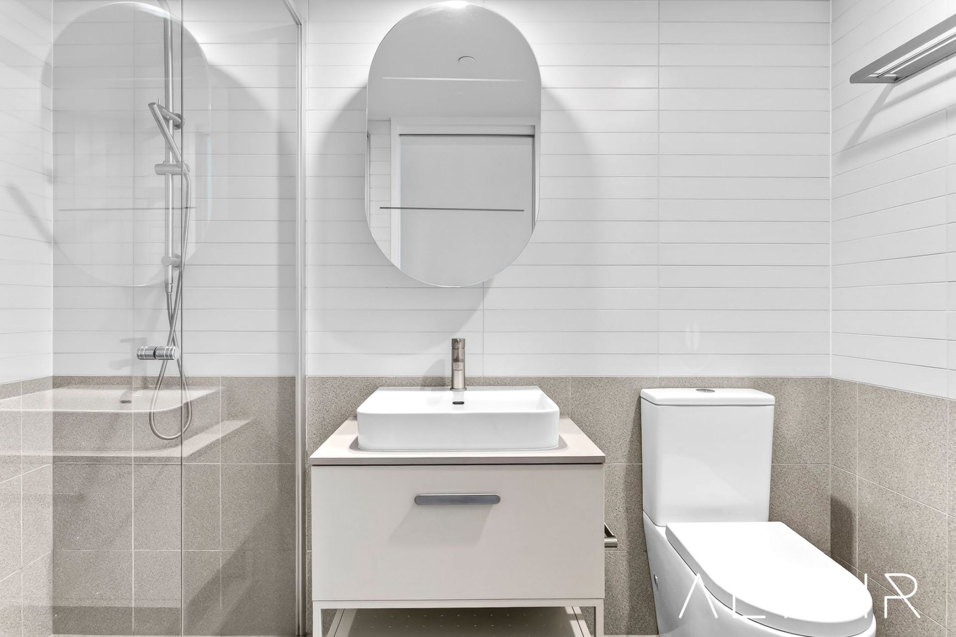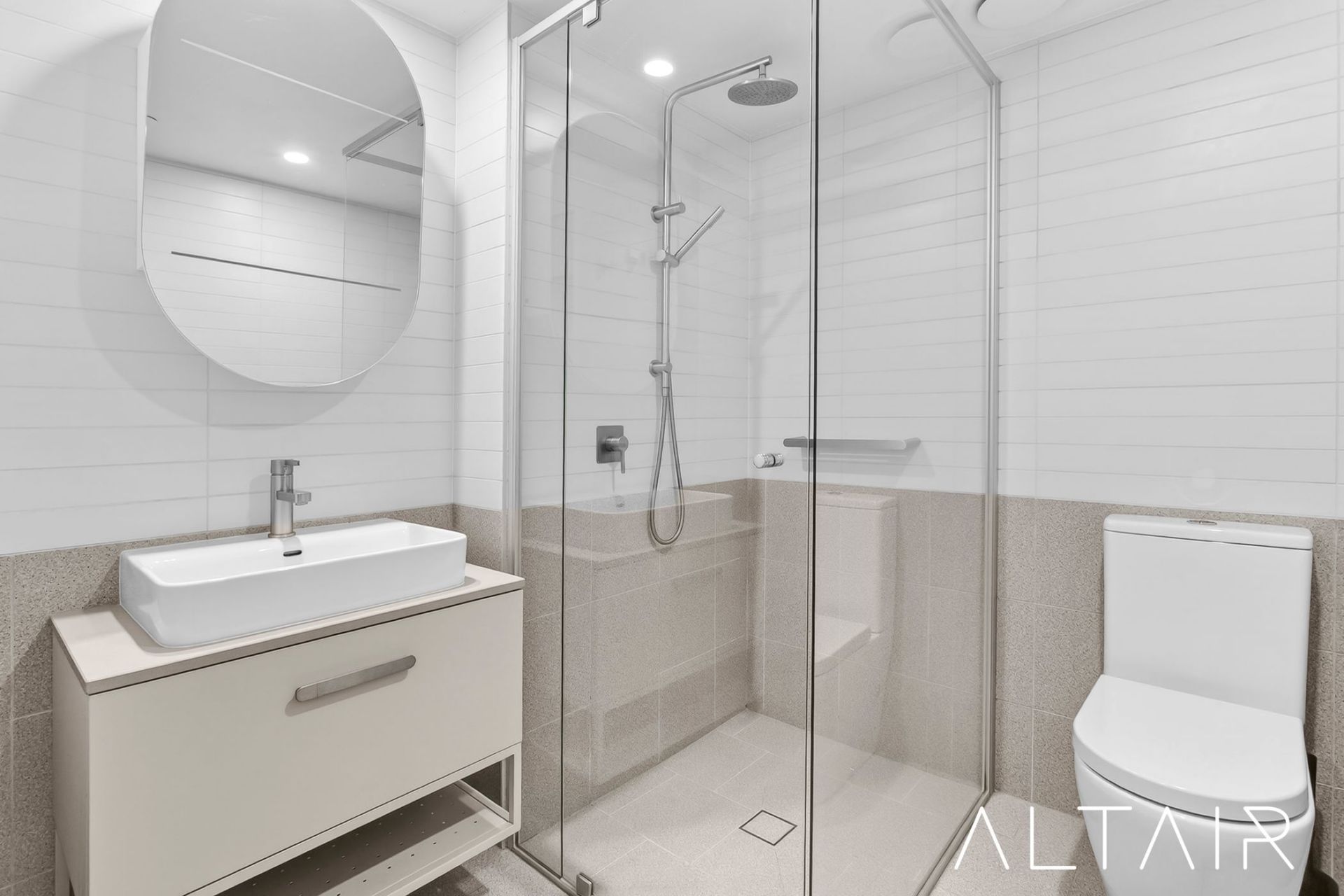 The modern bathrooms both feature designer finishes including full height tiling, custom built vanity units, semi-frameless shower screens & mirror shaving cupboard.