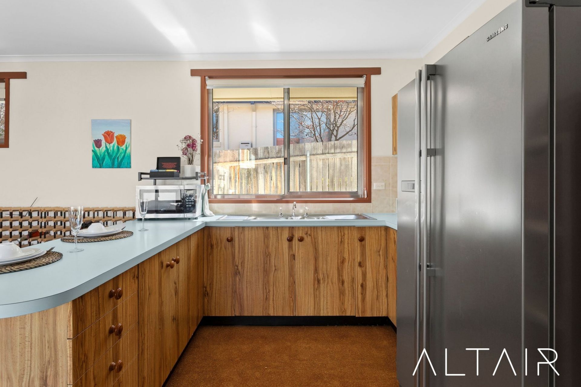 The renovated kitchen provides a functional space featuring modern stainless-steel appliances, while both bathrooms have also been stylishly upgraded.