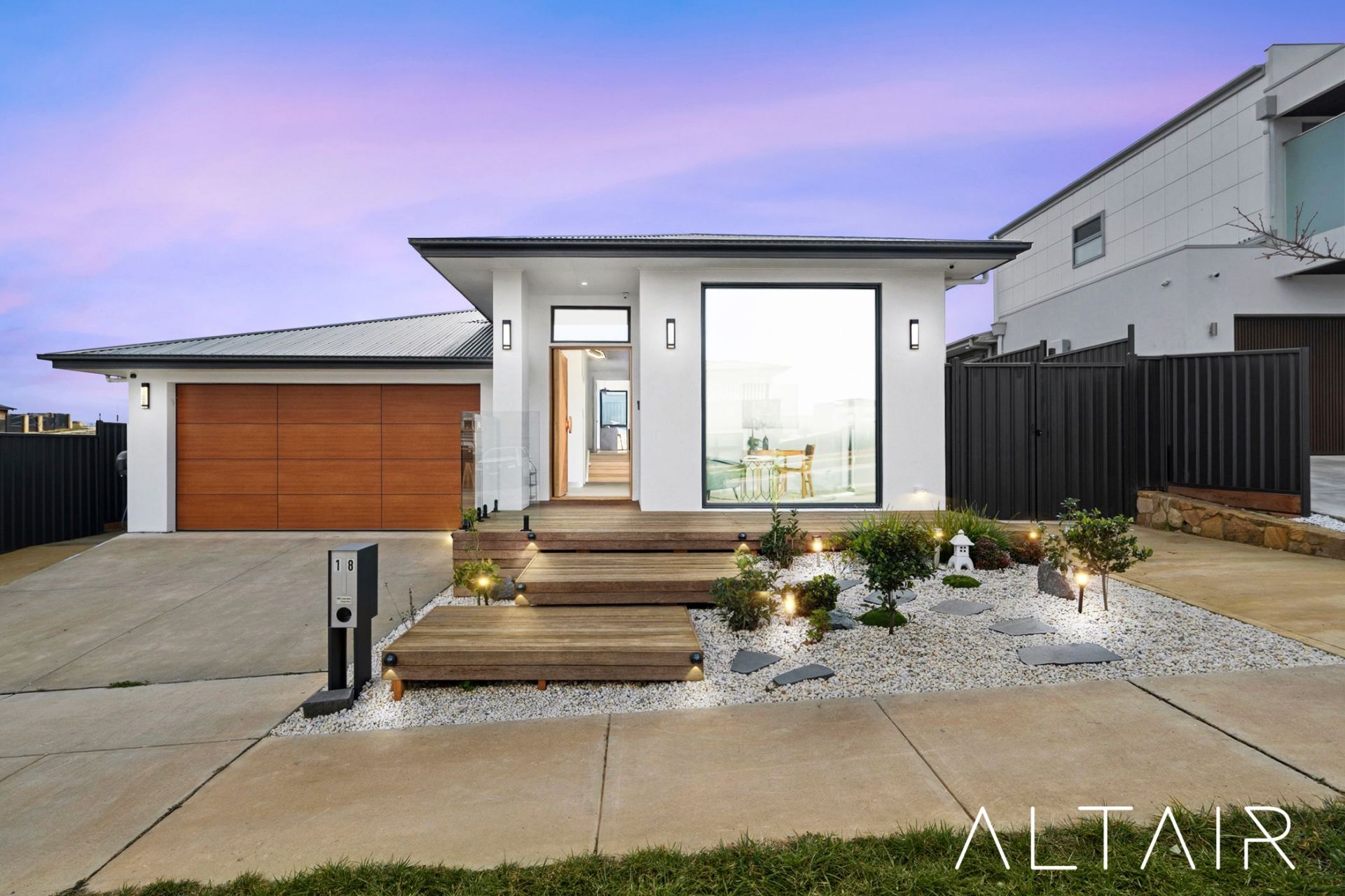 Introduced by its wide frontage and striking street presence, the home is framed by oversized windows, a grand pivot door, feature cladding, and a premium panel lift garage door. A landscaped front garden leads to a welcoming entrance portico, making a memorable first impression.