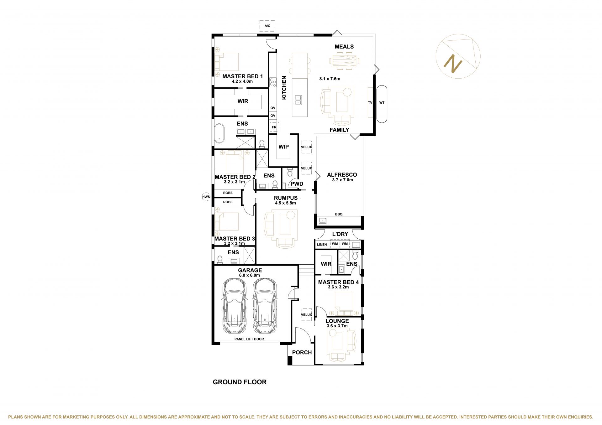 A versatile rumpus room connects the main living spaces and can be tailored to suit your lifestyle-whether as a second lounge, kids' retreat, or media room. At the front of the home, a segregated lounge or office area offers the ideal space for working from home or relaxing in peace. The large laundry room features extra bench space, overhead cabinetry, internal storage, and space for two washers and dryers.