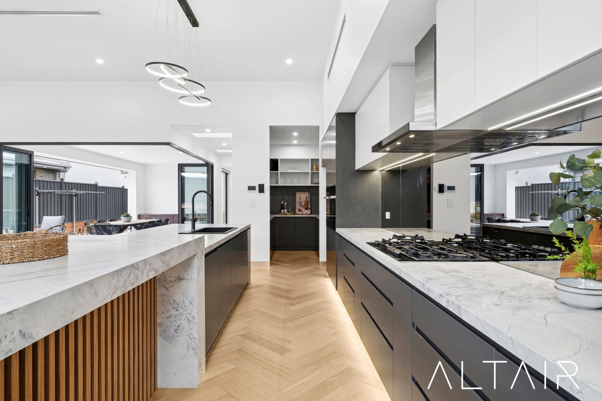 The gourmet kitchen is a true centrepiece, fitted with a striking 5m island bench showcasing a blend of 40mm, 80mm, and 100mm stone benchtops. Premium Miele appliances & a Bosch 5-burner glass cooktop, a 600mm electric oven, a 600mm steam oven, a semi-integrated dishwasher, and soft-close cabinetry. A generous walk-in pantry provides additional bench space and custom joinery-ensuring the kitchen is as practical as it is stylish.