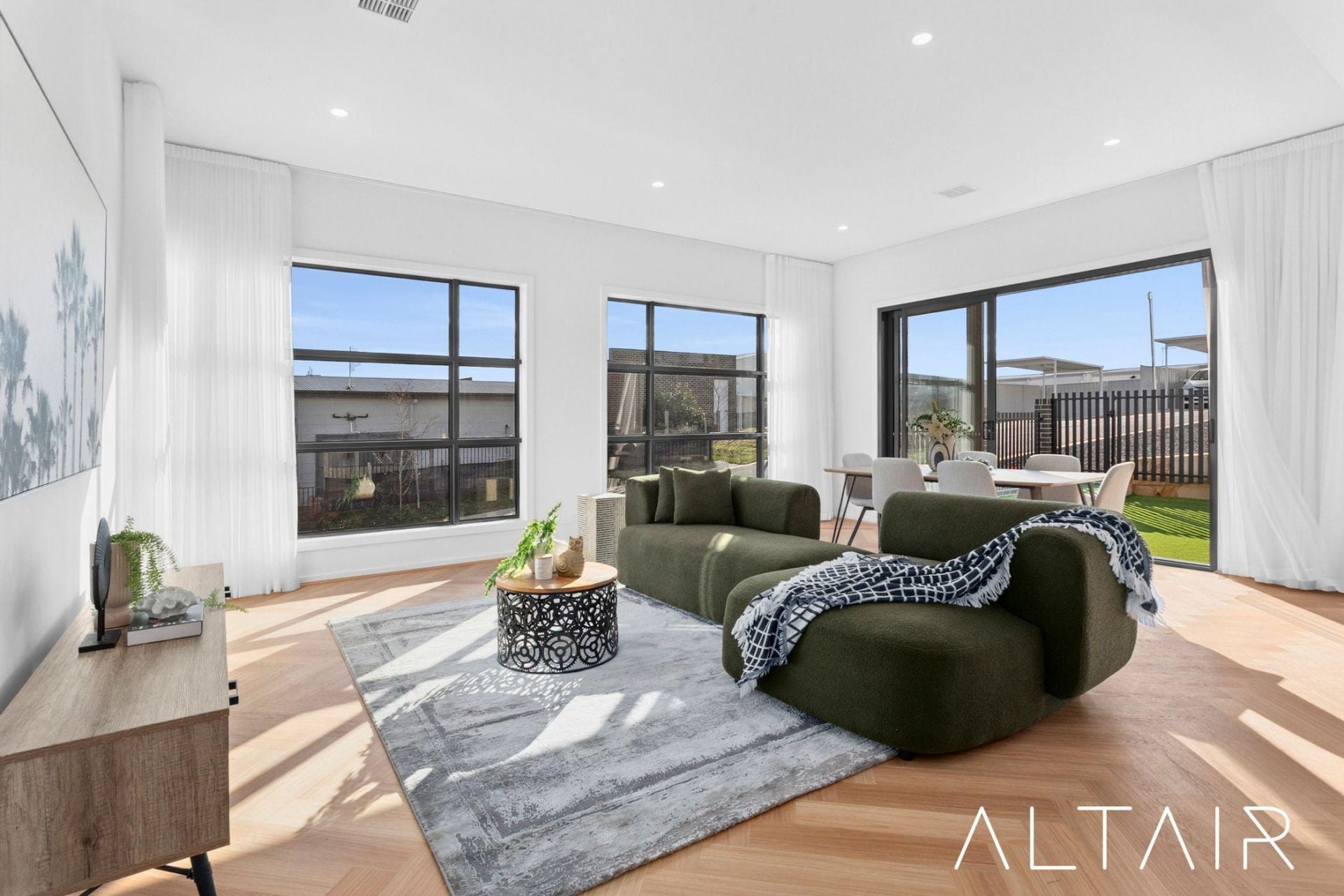 Flooded with natural light, the north-facing living and dining areas take centre stage, showcasing high ceilings, designer lighting, and large double-glazed doors that open seamlessly to a landscaped outdoor space, perfect for entertaining or simply relaxing while enjoying the north-facing aspect.