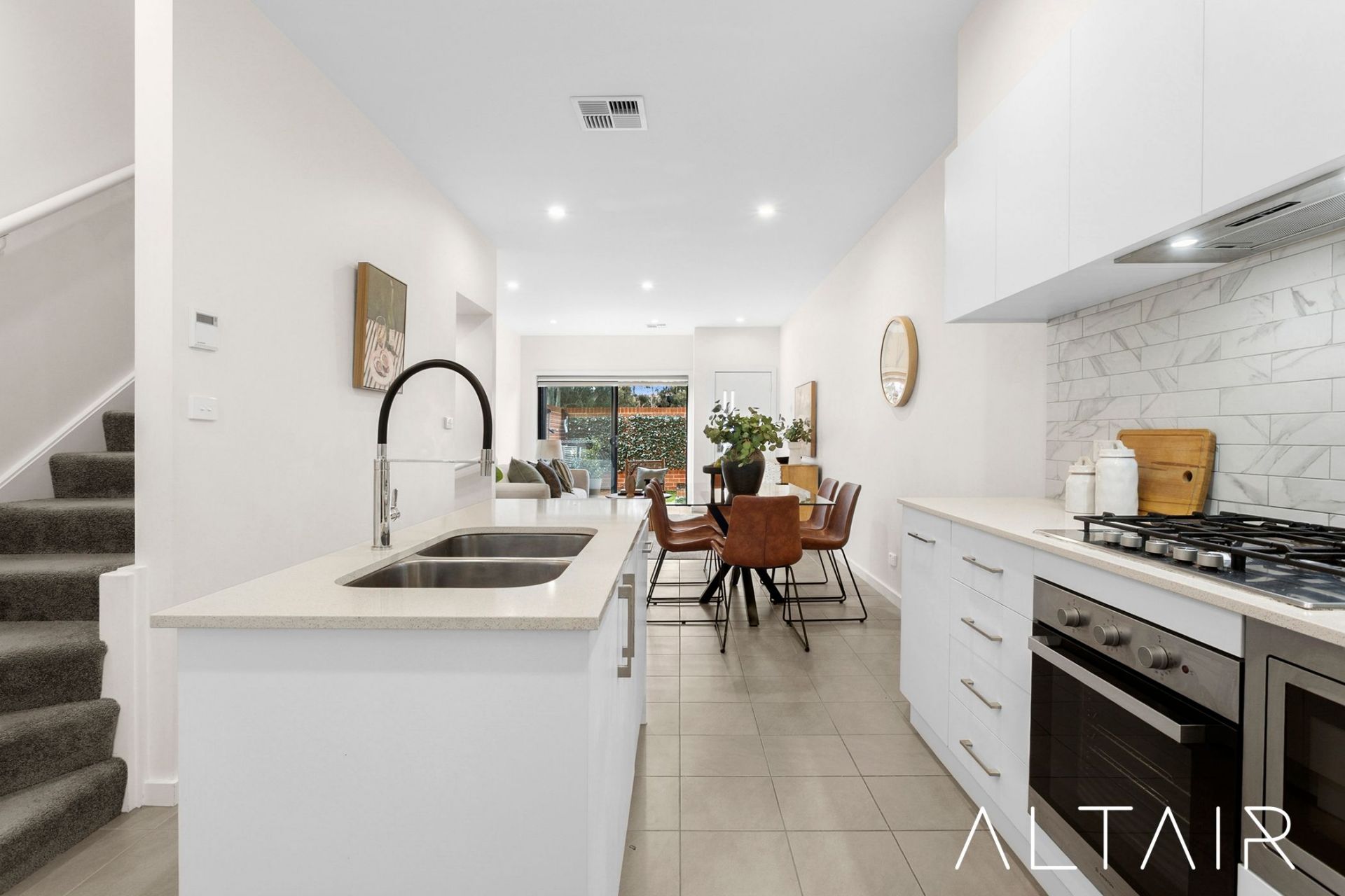 Step inside and you'll immediately appreciate the open-plan layout, with the heart of the home set on the ground floor. Here, a gourmet kitchen with stone benchtops, island bench, stainless steel appliances, and abundant storage flows effortlessly into the dining and living areas. Sliding doors open out to a private courtyard, creating the perfect indoor–outdoor connection for entertaining or quiet relaxation. A spacious third bedroom with built-in robe and an additional powder room complete this level, offering ideal guest accommodation or multi-generational living.
