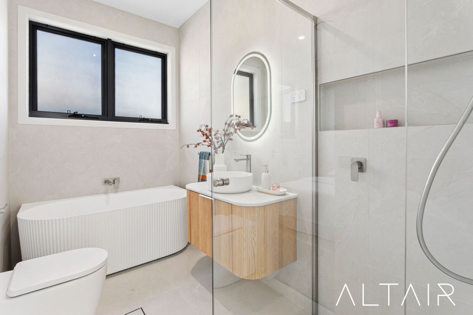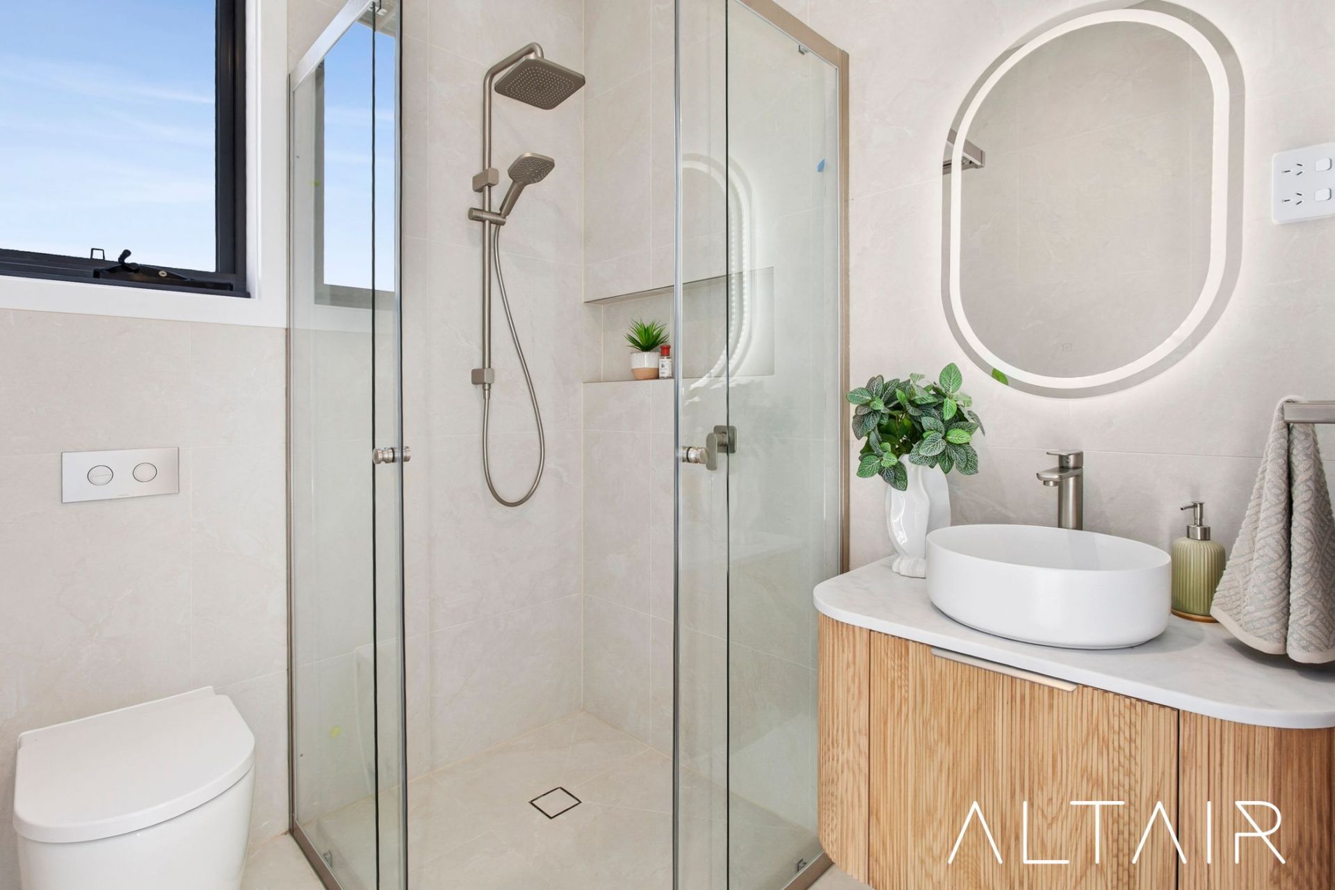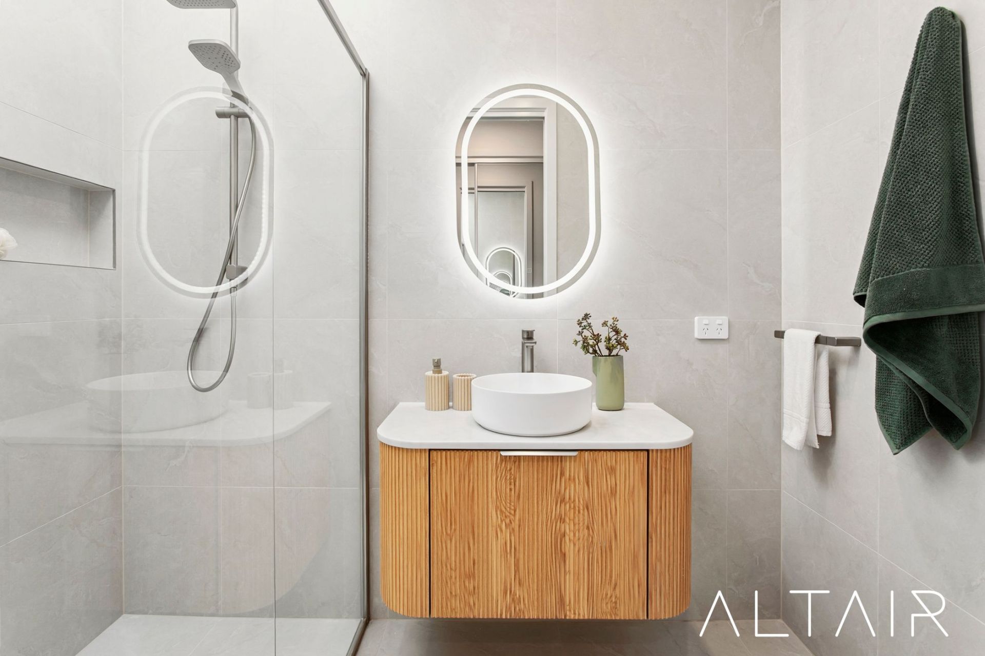 - Full-height tiling, premium fixtures & floating vanities in bathrooms