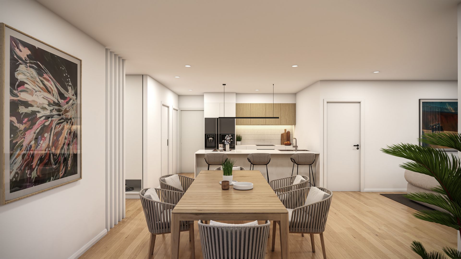 Large windows and a Northerly aspect flood the interiors with natural light, enhancing the warmth of the hybrid timber flooring. The designer kitchen is both stylish and functional, featuring stone benchtops, a breakfast bar, and premium Fisher & Paykel appliances.
